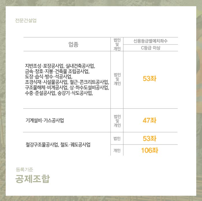 공사, 계약, 이행, 하자 및 보수 등의 보증업무를 해주는 공제조합의 경우 다소의 위험성을 보유한 건설산업 특성 상 면허 취득을 위해 반드시 준비되어야 하는 부분입니다.