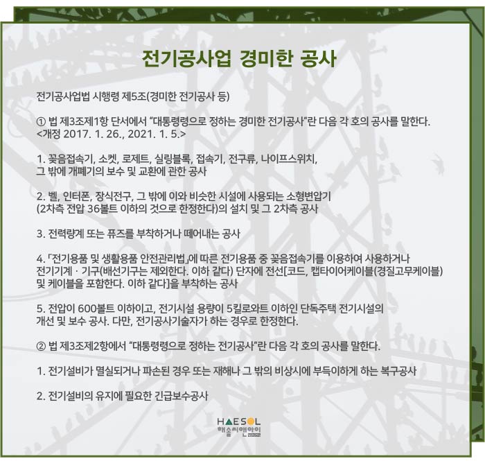 | 전기공사업 등록을 위해 준비해야 하는 필수 등록기준 (4) | 2024.10.21 |