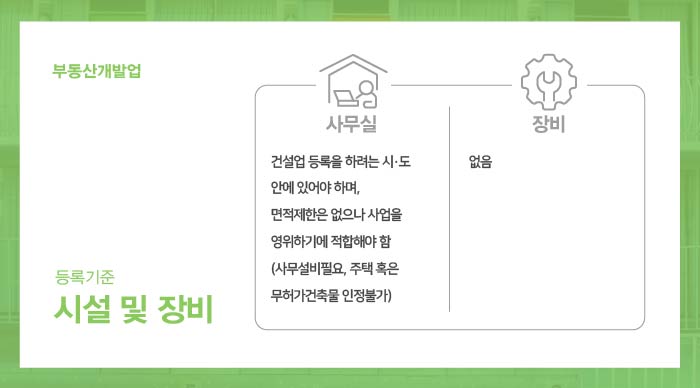 부동산개발업의 경우 별도로 규정된 특수 장비가 없으므로 시설로서 사무실의 요건을 잘 갖추어 준비해주시면 됩니다.