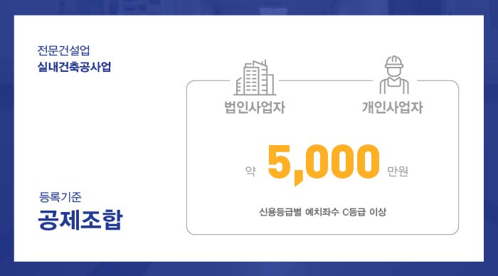 공제조합은 실내건축공사업 영위 시 발생되는 다양한 보증관련 업무를 처리해주는 곳으로 법인과 개인사업자 모두 약 5천만원의 금액을 전문건설공제조합에 출자금으로써 예치 진행해주신 후 보증가능금액확인서를 발급받아 면허 접수 시 함께 제출될 수 있도록 준비해주셔야 합니다.