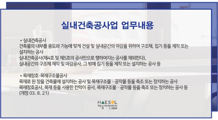 실내건축공사업은 실내건축공사와 목재창호·목재구조물공사가 해당되며,