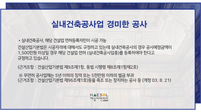 건설산업기본법은 시공자격에 대해서도 규정하고 있으며, 공사예정금액이 1,500만원 이상일 경우 해당 건설업 면허(실내건축공사업종)를 등록하여야 합니다.