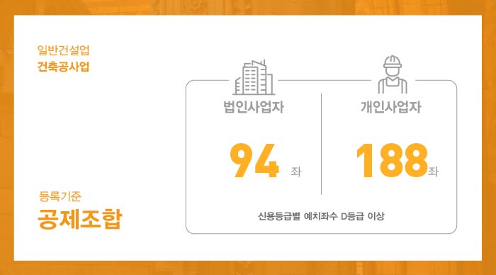 이에 따라 건축공사업은 건설공제조합에 일정 금액을 출자 예치한 후 보증가능금액확인서를 발급받아 면허 신청 시 제출하셔야 하는데, 예치되어야 할 출자 금액은 공제조합 내에서 자체적으로 실시하는 신용평가 결과 등급과 예치 시기에 따라 조금씩 상이하나, 신규로 면허를 등록하는 경우라면 기존에 별도로 평가받을 실적이 존재하지 않기때문에 통상적으로 최대좌수에 해당하는 금액을 예치하게된다고 보시면 됩니다. (법인 94좌, 개인 188좌) 2024년 8월 현재 시점 기준 건설공제조합 1좌당 금액은 1,551,800원입니다.