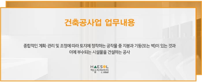 건축공사업은, 종합적인 계획·관리 및 조정에 따라 토지에 정착하는 공작물 중 지붕과 기둥 또는 벽이 있는 것과 이에 부수되는 시설물을 건설하는 공사로, 이와 같은 공사 진행을 위해 면허를 등록하여 자격을 갖추는 것은 필수 사항입니다.