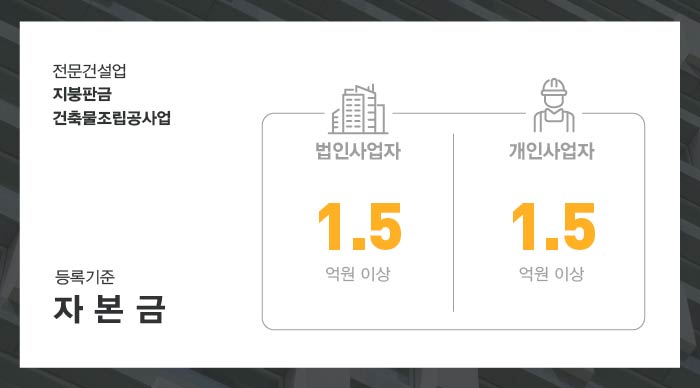지붕판금건축물조립공사업 면허 등록을 위해서는 법인 및 개인사업자 모두 자본금 1억 5천만원 이상이 필요합니다.