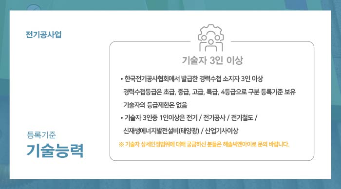 전기공사업 기술능력 기준으로는 3인 이상의 기술자를 보유해야 합니다.