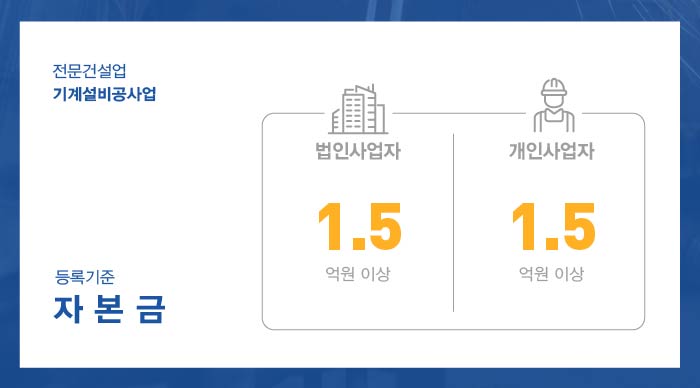 개인사업자는 실질자본금으로써 1억 5천만원 이상 준비를, 법인사업자는 실질자본금과 더불어 법인등기부등본상의 자본금 또한 1억 5천만원 이상 준비되도록 함께 준비해주셔야 하며, 사업목적란에 기계설비공사업에 관한 목적이 반드시 추가되어야 합니다.