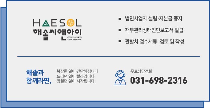다만 회사의 기장을 보는 기장세무사 및 회계사를 통해서는 발급 불가한 점 참고하시기 바라며, 해솔씨앤아이에서도 재무제표 검토와 더불어 기업진단보고서 발급을 함께 진행하고 있으니 필요하신 경우 문의주시기 바랍니다.