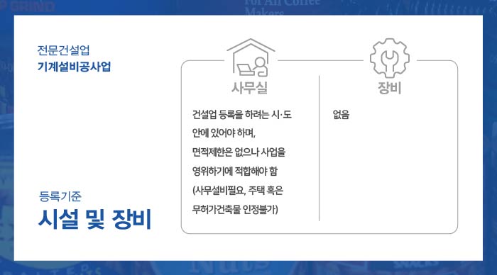 면허 등록을 위해서는 자본금, 공제조합출자, 기술능력, 시설 및 장비의 규정된 요건을 빠짐없이 충족해야하는데