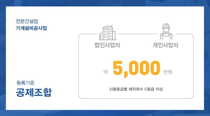 개인사업자 및 법인사업자 모두 전문건설공제조합을 통해 약 5,000만원의 금액을 출자금으로 예치해주신 후 보증가능금액확인서를 발급받아 면허 접수 시 제출될 수 있도록 준비해주셔야 하는데, 예치에 필요로 한 정확한 금액은 예치 시기나 회사의 신용평가 등급에 따라 다소의 차이가 있을 수 있습니다.