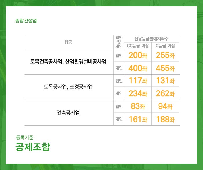 이에 따라 종합건설면허는 건설공제조합에 일정 금액을 출자 예치한 후 보증가능금액확인서를 발급받아 면허 신청 시 제출하셔야 하는데, 예치되어야 할 출자 금액은 공제조합 내에서 자체적으로 실시하는 신용평가 결과 등급과 예치 시기에 따라 조금씩 상이하나, 신규로 면허를 등록하는 경우라면 기존에 별도로 평가받을 실적이 존재하지 않기때문에 통상적으로 최대좌수에 해당하는 금액을 예치하게된다고 보시면 됩니다.