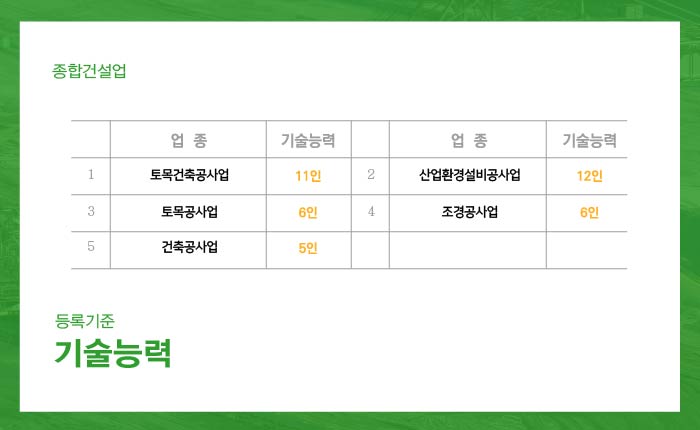종합건설면허 기술능력 등록기준 충족을 위해서는 업종별로 규정된 자격을 갖춘 기술자 보유가 필요합니다.