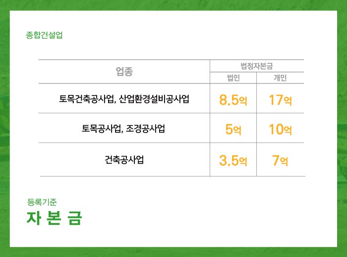 종합건설면허 취득을 위해서는 업종별로 규정된 자본금 이상을 보유해야 합니다.
