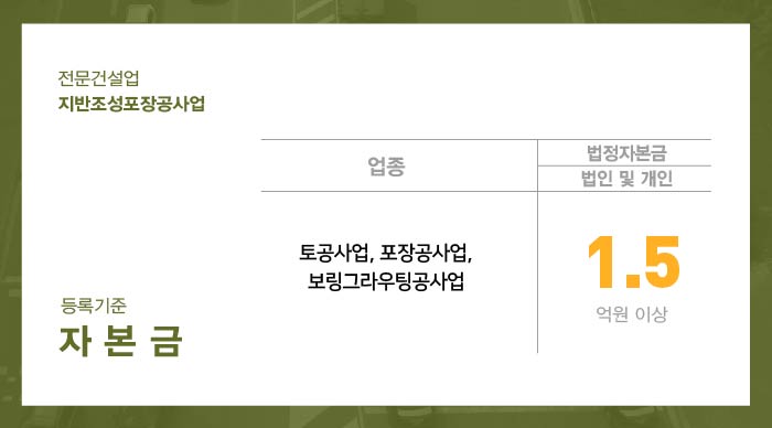 자본금은 법인사업자나 개인사업자 모두 준비해야 하는 기준 금액은 같으나, 법인사업자는 법인등기부등본상 납입자본금 또한 등록기준 이상을 충족해야 하며, 사업목적란에 지반조성포장공사업에 관한 목적 또한 기재가 되어야 합니다.