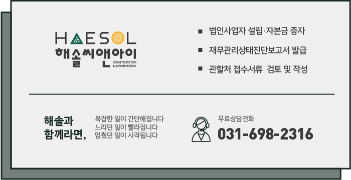 기계설비가스공사업 면허 등록을 위한 법인사업자 설립부터 자본금 증자, 기업진단보고서 발급과 관할처 접수서류 검토 및 작성에 이르기까지 면허 취득에 대한 도움이 필요하신 경우 건설면허 전문가 해솔씨앤아이로 문의주시기 바랍니다.