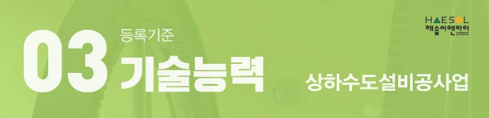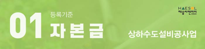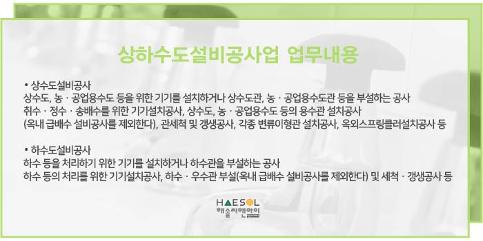 상하수도설비공사업 면허 등록을 위한 법인사업자 설립부터 자본금 증자, 기업진단보고서(재무관리상태진단보고서) 발급, 관할처 접수서류 검토 및 작성에 이르기까지 전 과정을 해솔씨앤아이와 함께 해 보세요!