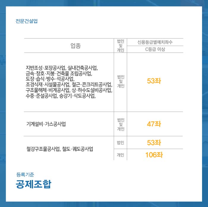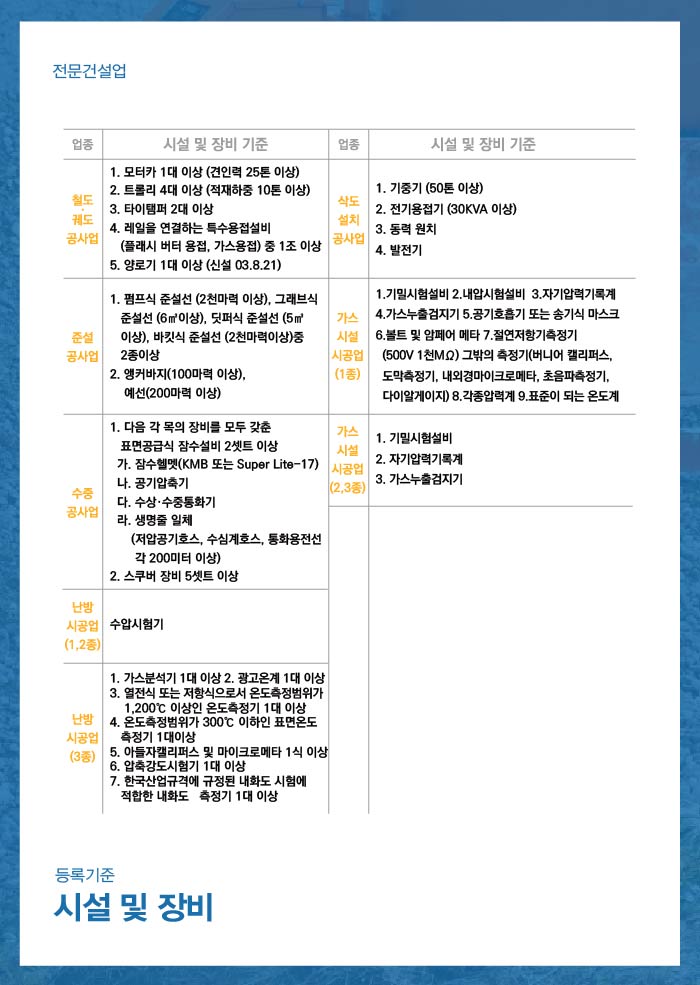 면허 등록을 위해서는 자본금, 공제조합출자, 기술능력, 시설 및 장비의 규정된 요건을 빠짐없이 충족해야하는데