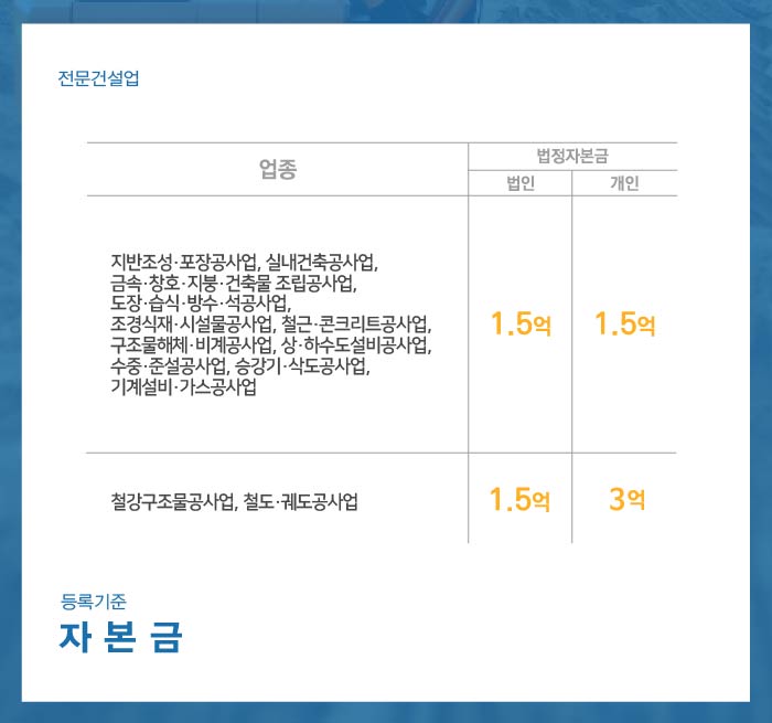 전문건설업면허 등록을 하기 위한 자본금을 준비해주셔야 합니다.