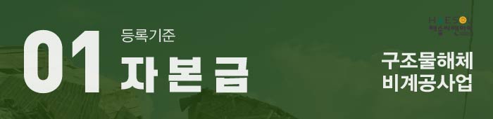 개인사업자는 실질자본금으로써 1억 5천만원 이상 준비를, 법인사업자는 실질자본금과 더불어 법인등기부등본상의 자본금 또한 1억 5천만원 이상 준비되도록 함께 준비해주셔야 하며, 사업목적란에 비계구조물해체공사업에 관한 목적이 반드시 추가되어야 합니다.