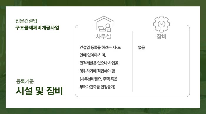 면허 등록을 위해서는 자본금, 공제조합출자, 기술능력, 시설 및 장비의 규정된 요건을 빠짐없이 충족해야하는데