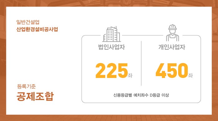 산업환경설비공사업의 경우 건설공제조합을 이용하게되며, 이 곳에 출자 예치하는 금액은 회사의 신용평가 등급에 따라 조금씩 차이가 있으나 신규로 면허를 등록하는 경우라면 기존에 별도로 평가받을 실적 등이 존재하지 않으므로 보통 미평가로 진행하여 최대좌수(법인 225좌, 개인 450좌)에 상응하는 금액을 예치하게 된다고 보시면 됩니다. '24. 8월 현재 시점 기준 건설공제조합 1좌당 금액은 1,551,800원입니다.