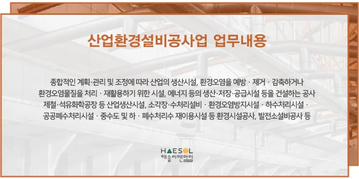 산업환경설비공사업에는 종합적인 계획과 관리 및 조정에 따라 산업의 생산시설, 환경오염을 예방 · 제거 · 감축하거나 환경오염물일을 처리 · 재활용하기 위한 시설, 에너지 등의 생산 · 저장 · 공급시설 등을 건설하는 공사 등이 업무 범위에 해당됩니다.