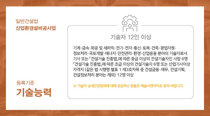 기술자는 기계 · 금속 · 화공 및 세라믹 · 전기 · 전자 · 통신 · 토목 · 건축 · 광업자원 · 정보처리 · 국토개발 · 에너지 · 안전관리 · 환경 · 산업응용 분야의 기술자로서 기사 또는 한국건설기술인협회에서 발급하는 중급 이상의 경력수첩 보유자 6인과 초급 이상의 경력수첩 보유자 6인 또는 산업기사 이상의 자격자 (건설금융 · 재무, 건설기획, 건설정보처리 분야는 제외) 12인 이상으로 구성되어야 합니다.