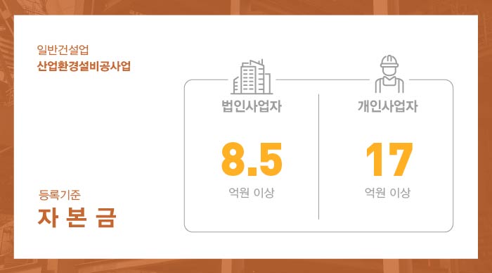 산업환경설비공사업 면허 등록을 위해서는 자본금 법인 8억 5천만원 이상, 개인사업자 17억 이상이 준비되어야 합니다.
