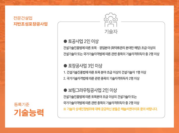 기술인력의 준비는 면허 등록을 할 때 뿐만 아니라, 면허를 취득하고 사업을 운영하는 전 기간동안 상시 유지되어야 하는 등록기준 사항이기 때문에 추후 기술자 퇴사 등으로 인한 기술인력의 등록기준 미충족 사유 발생 시, 발생일로부터 50일 이내 자격요건을 충족하는 기술자가 충원되어야만 안정적인 면허 유지가 가능하게 됨을 양지해야 합니다.