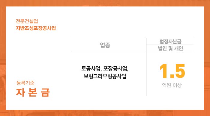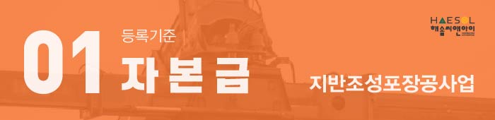 법인과 개인사업자 모두 자본금 1억 5천만원 이상을 보유해야 지반조성포장공사업 면허 취득이 가능하게 됩니다.