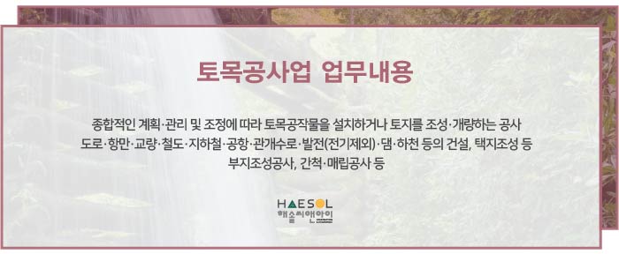 토목공사업은 종합적인 계획·관리 및 조정에 따라 토목공작물을 설치하거나 토지를 조성·개량하는 공사로, 건설산업기본법에 의거하여 공사예정금액이 5,000만원 이상 일 경우 해당 공사업 면허를 보유하고 있다는 전제 하에 공사 및 업무 진행이 가능합니다.