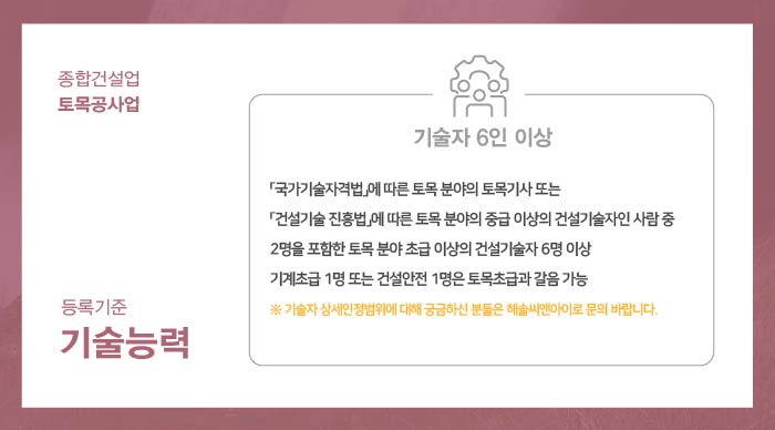 기술자는 국가기술자격법에 따른 토목 분야의 토목기사 또는 한국건설기술인협회에서 발급하는 토목 분야 중급 이상의 경력수첩 보유자 중 2인을 포함한 토목 분야 초급 이상의 경력수첩 보유자 6인 이상으로 구성되어야 하며, 상시 근로가 원칙이므로 타사 겸업 및 겸직은 불가합니다.