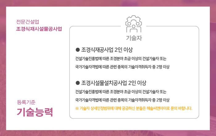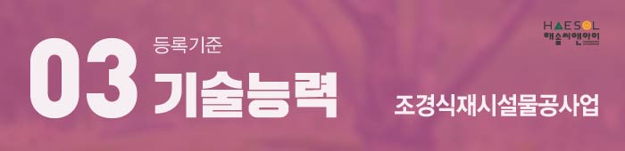 조경식재시설물공사업 면허 등록을 하기 위해 준비 해 주셔야 하는 기술인력은 한국건설기술인협회에서 발급하는 조경분야 초급 이상의 경력수첩을 소지하거나 관련 종목의 국가기술자격증을 취득하신 분들로서 구성되어야 합니다.