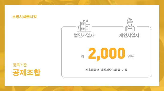 소방시설공사업의 경우 소방산업공제조합에 약 2,000만원 가량의 출자금 예치가 필요합니다.