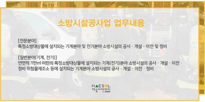 소방시설공사업은 특정 소방대상물에 설치되는 기계분야 및 전기분야의 소방시설의 공사, 개설, 이전 및 정비를 전문으로 하는 사업입니다.