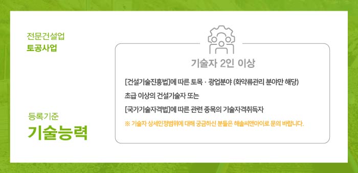 토공사업 면허 등록을 위해 준비해야 하는 2인 이상의 기술자는 반드시 건설기술진흥법에 따른 토목, 광업분야(화약류관리 분야만 해당) 초급 이상의 건설기술자 또는 국가기술자격법에 따른 관련 종목의 기술자격취득자로서 구성이 되어야 합니다.