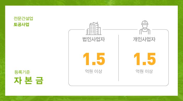 토공사업 등록을 위한 자본금 1억 5천만원 이상 준비가 필요합니다.