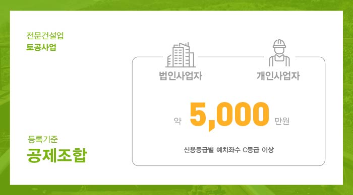 공제조합은 사업 운영 시 수반되는 다양한 보증업무를 처리하는 곳으로 법인 및 개인사업자 모두 약 5천만원의 금액을 전문건설공제조합에 출자금으로 예치 해주신 후 보증가능금액확인서를 발급받아주셔야 하는데, 예치에 필요한 정확한 금액은 예치 시기 및 회사의 신용등급평가에 따라 차이가 있을 수 있기 때문에 예치 전 정확한 금액을 별도 안내받으셔야 합니다.