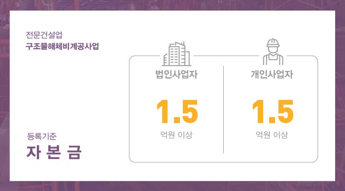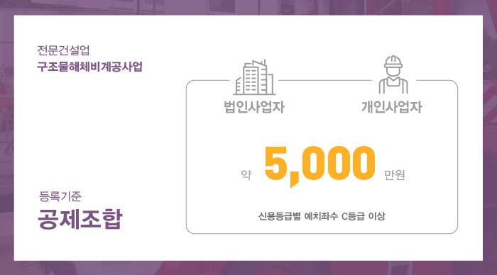 구조물해체비계공사업의 경우 전문건설공제조합을 통해 법인 및 개인사업자 모두 약 5,000만원의 금액을 출자금으로써 예치해주신 후 보증가능금액확인서를 발급받아 공제조합에 관한 준비를 진행하실 수 있습니다.