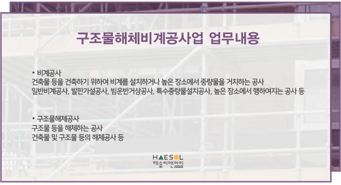 구조물해체비계공사업은 기존의 비계구조물해체공사업의 명칭이 변경된 것으로 업무 범위에는 비계공사와 구조물해체공사가 해당됩니다.