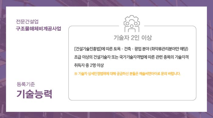 자격요건을 충족하는 기술자 2인 이상이 필요합니다.