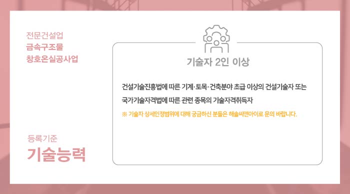 기술인력은 건설기술진흥법에 따른 기계, 토목, 건축 분야 초급 이상의 건설기술자 또는 국가기술자격법에 따른 관련 종목의 기술자격취득자로써 총 2인 이상이 준비되어야 합니다.