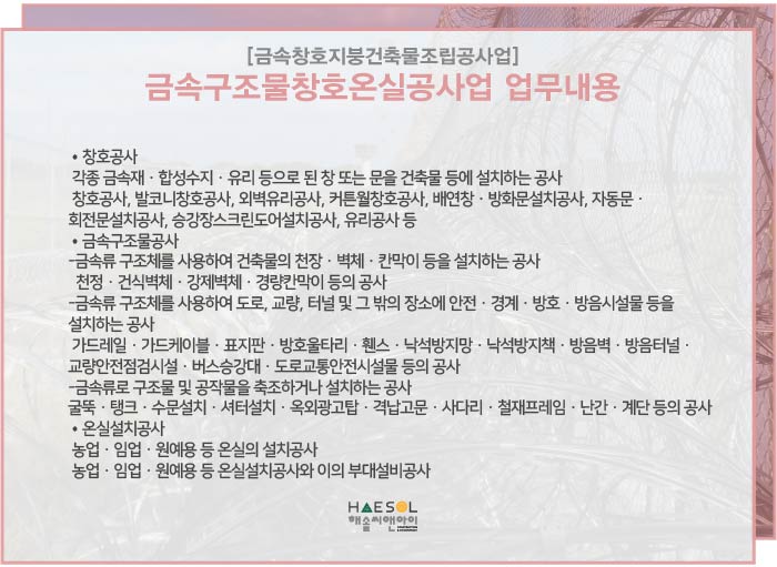 금속구조물창호온실공사업 면허 등록에 대해 더 자세한 내용이 궁금하시다면 건설면허 전문가 해솔씨앤아이로 문의주세요!