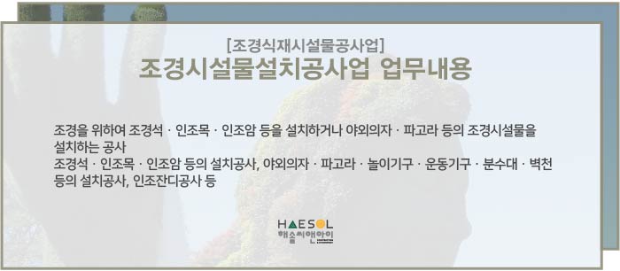 조경시설물설치공사업은 조경석, 인조목, 인조암 등의 설치공사, 야외의자, 파고라, 놀이기구, 운동기구, 분수대, 벽천 등의 설치공사, 인조잔디공사 등 조경을 위하여 조경시설물을 설치하는 공사로서 건설산업기본법에 의거하여 공사예정금액이 1,500만원 이상일 경우 반드시 해당 면허 등록이 필요합니다.