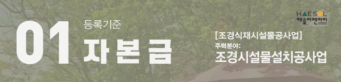 자본금은 건설업 영위를 목적으로 한 건설업 실질자본금으로써 법인 및 개인사업자 모두 1억 5천만원 이상의 자본금을 준비해주셔야 합니다.