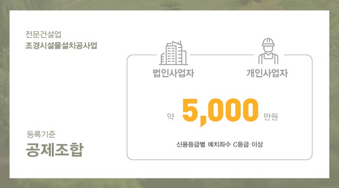 조경시설물설치공사업 면허 등록을 위해서는 공사, 계약, 이행, 하자 및 보수 등의 보증업무를 위한 공제조합 준비가 반드시 필요하며, 이를 위해 공제조합 출자의 과정이 진행되어야 합니다.