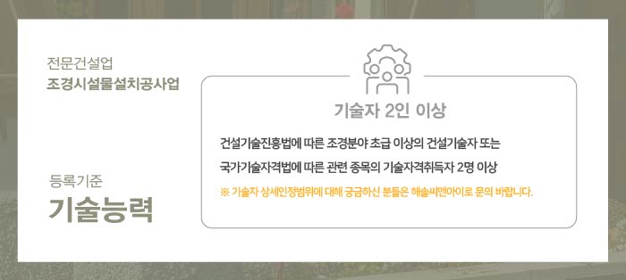 기술자는 건설기술진흥법에 따른 조경 분야 초급 이상의 건설기술자 또는 국가기술자격법에 따른 관련 종목의 기술자격취득자로 1인 1자격만 인정되기 때문에 최소 인력의 수로써 2인 이상이 구성되어야 합니다.