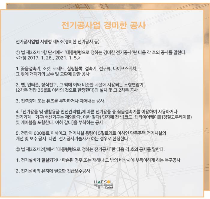 오늘은 전기공사업 등록기준에 대하여 살펴보는 시간을 가져보겠습니다.