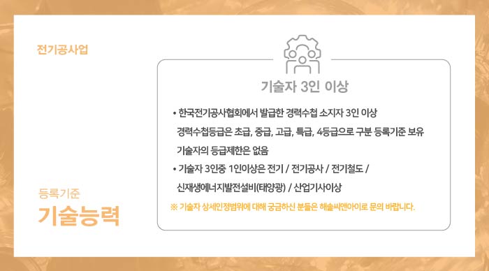 전기공사업 기술능력 기준으로는 3인 이상의 기술자를 보유해야 합니다.