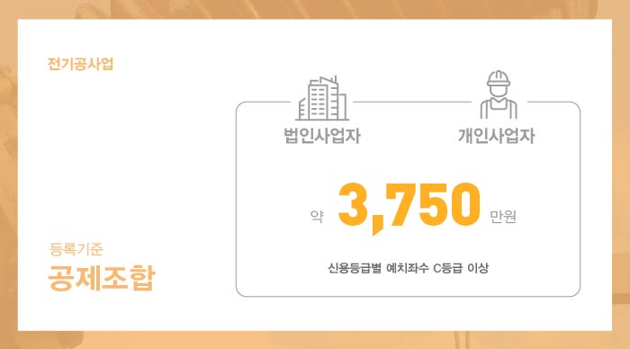 전기공사업 등록을 위해서는 전기공사공제조합을 통해 일정 금액을 출자금으로 예치 진행하신 후 출자금예치증명원을 발급받아 면허 접수 시 제출하셔야 합니다.